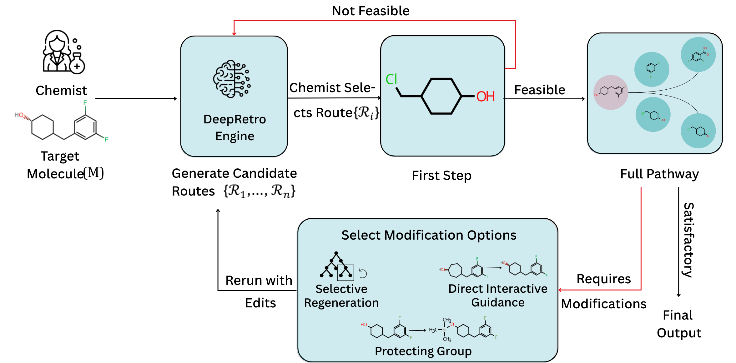 A core design principle of DeepRetro is to empower chemists by incorporating several human-in-the-loop (HITL) capabilities, recognizing that the combination of machine-generated routes and expert intuition leads to the most practical outcomes. Through an interactive graphical user interface (GUI), domain experts can visualize and intervene in the retrosynthetic planning process in real-time.