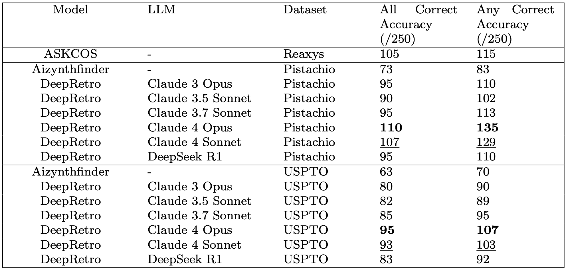 We evaluated DeepRetro on standard retrosynthesis benchmarks and complex case studies. In automated mode, the framework achieves state-of-the-art performance, with the Claude 4 Opus configuration successfully solving 96.3% (183/190) of targets in the USPTO-190 multi-step benchmark.